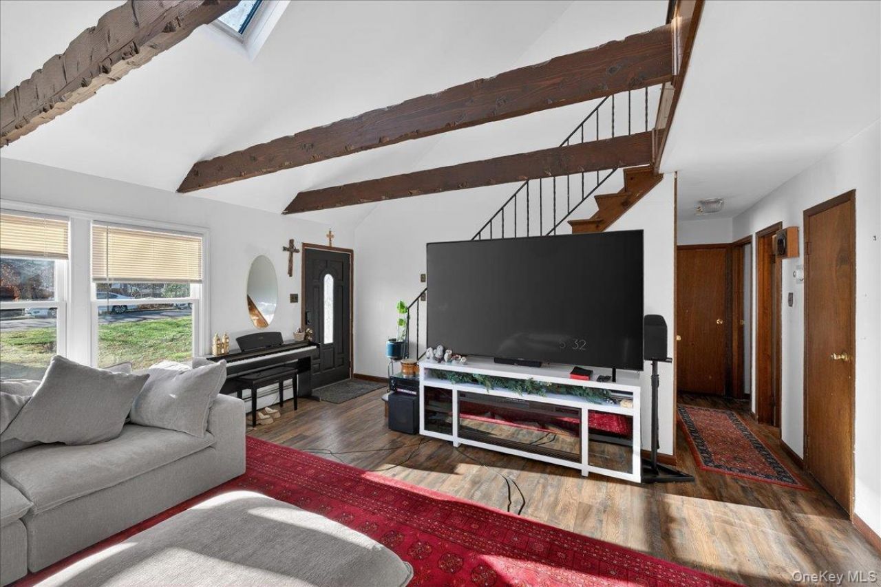 Welcome to this spacious and versatile home set on an oversized .44 acre lot just minutes from the Long Island Expressway for easy commuting. This 5 bedroom, 3 full bath home offers the perfect blend of space, comfort, and functionality.Step inside to a bright and airy living room featuring soaring ceilings, exposed beams, and skylights that fill the space with natural light. The home offers an eat-in kitchen with a center island, stainless steel appliances, and ample cabinet space perfect for everyday living and entertaining. A formal dining room provides the ideal setting for gatherings and special occasions.The home features generously sized bedrooms, including multiple large living areas that offer flexibility for extended family, guests, or a home office setup. Updated bathrooms include modern vanities and a beautifully tiled walk-in shower.Additional highlights include central air, forced hot air heating, and a RainSoft water filtration system throughout the entire home. The layout offers a unique and open feel with great natural light in every room.Step outside to your expansive backyard featuring an in-ground pool, patio space, and plenty of room for entertaining, relaxing, or creating your own outdoor oasis. The large driveway and attached garage provide ample parking.This home offers space, character, and convenience all in one. Don't miss this opportunity to own a unique property with endless potential.